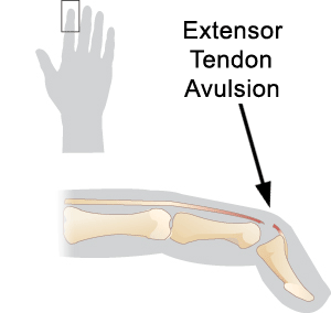This fracture results from a trauma to tip of the finger forcing it into flexion (rapidly bending it down toward the palm) and avulsing the extensor tendon. This injury commonly occurs in baseball and basketball when attempting to catch a ball. Signs and symptoms include pain, swelling, and an inability to straighten out the last digit of the involved finger.