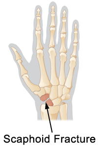 This is a common carpal wrist bone fracture. Often wrongly diagnosed as a wrist sprain, there is tenderness or pain where the base of the thumb meets the wrist, an area called the anatomical snuffbox. It usually occurs in the adolescent or young adult with a fall on the outstretched hand or with high velocity wrist injuries (like motorcycle accidents).
